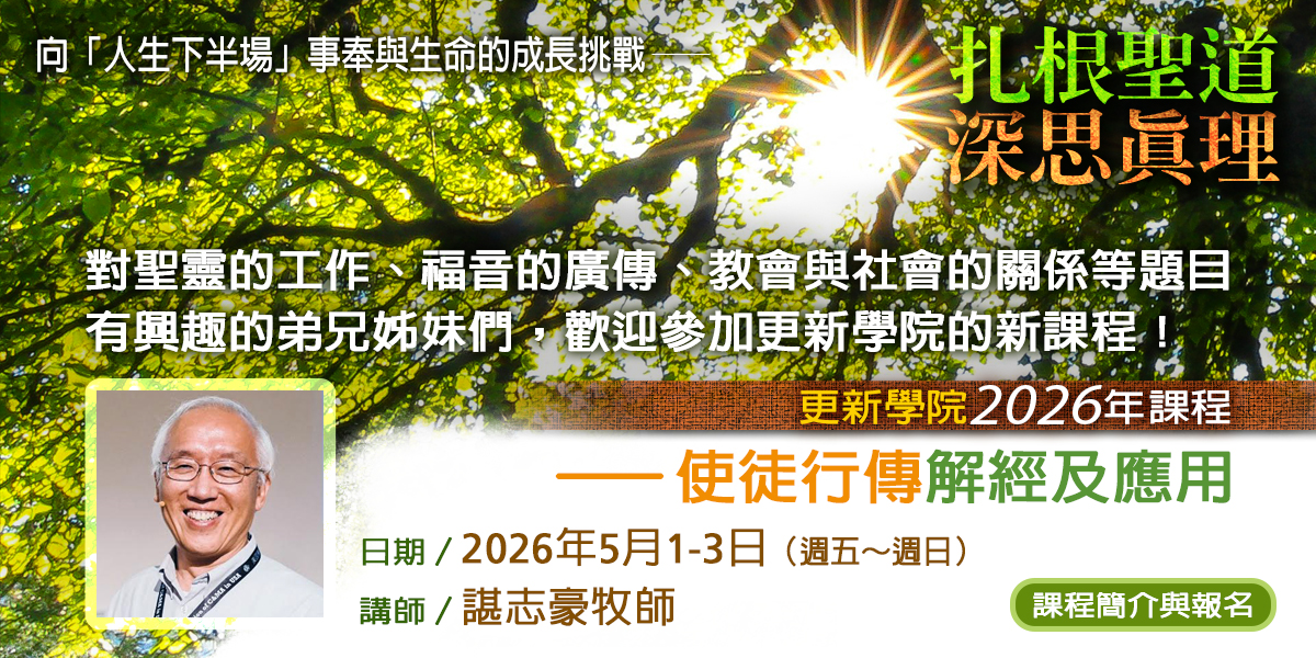 Christian Renewal Ministries Mission & VisionChristian Renewal Ministries NIV Study Bible有聲書尋道本聖經以福音為中心的領導以書會友2026更新神學課程研讀本聖經更新書房 App三百團契更新月刊Heading layerCRM Video Intro 詳細內容請點擊以上圖片進入各項專欄… 查詢有關 NIV中文版電子聖經, 更新學院近期課程報名, 講座, 讀書會, 更新書房電子禮券.....請按此鍵 初期教會暨使徒保羅行蹤II——蒙特內哥羅、阿爾巴尼亞、北馬其頓、希臘14 天 9/16/25 ~ 9/29/25 10/12/2024 更新聖經講座—彌賽亞詩篇 報名請按此鍵 2025 陳俊南老師語文課程希伯來文初階,希伯來文/希臘文查經 報名請按此鍵 異象 我們的異象是藉著各種管道和媒體,讓我們的事工能幫助華人信徒在主裡成長,靈命得以更新,進而幫助教會更新。我們的座右銘是「信徒更新、教會更新」 奉獻支持 三百團契 文字事工 中文聖經更新月刊更新書房 宣教事工 泰北事工 緬甸事工 外蒙古事工 傳道事工 更新講台 釋經講道 門徒訓練 更新學院 神學課程 事奉裝備 讀書會/讀經營/退修會 更新書房 要住在聖經裏,但要多多拜訪好書 — 司布真 試讀購買 更新月刊 歡迎登入更新網站,您的註冊加入將會在每個月和其他喜愛更新月刊的多年讀者羣一樣,按時收到內容豐富的更新月刊。並在第一時間知道更新最新動態和各種屬靈的新書推薦分享和優惠 訂閲 更新學院 「更新學院」Institute of Theological Seminars(簡稱ITS)與美國「哥倫比亞國際大學神學院」(簡稱SSM)有正式合作計畫。更新學院的師資 均頗負盛名 ,教學經驗豐富美善品格。目前亦舉辦影視教學和網上同步教學,歡迎讀者踴躍參加。 更多了解 門徒訓練 透過創作性,系統性和傳遞性的教材,以一對一的方式讓學員在基本信仰與實際生活的應用上扎根,并帶領他人以同樣方式在靈命上進深,成爲主的門徒。 更多了解