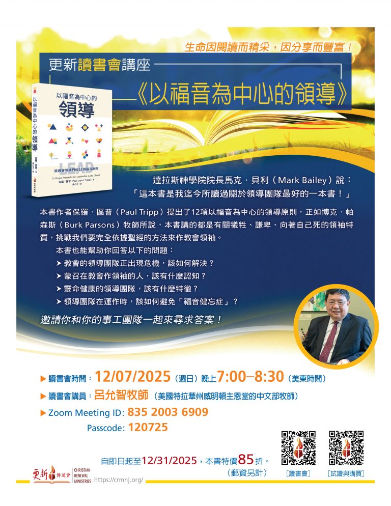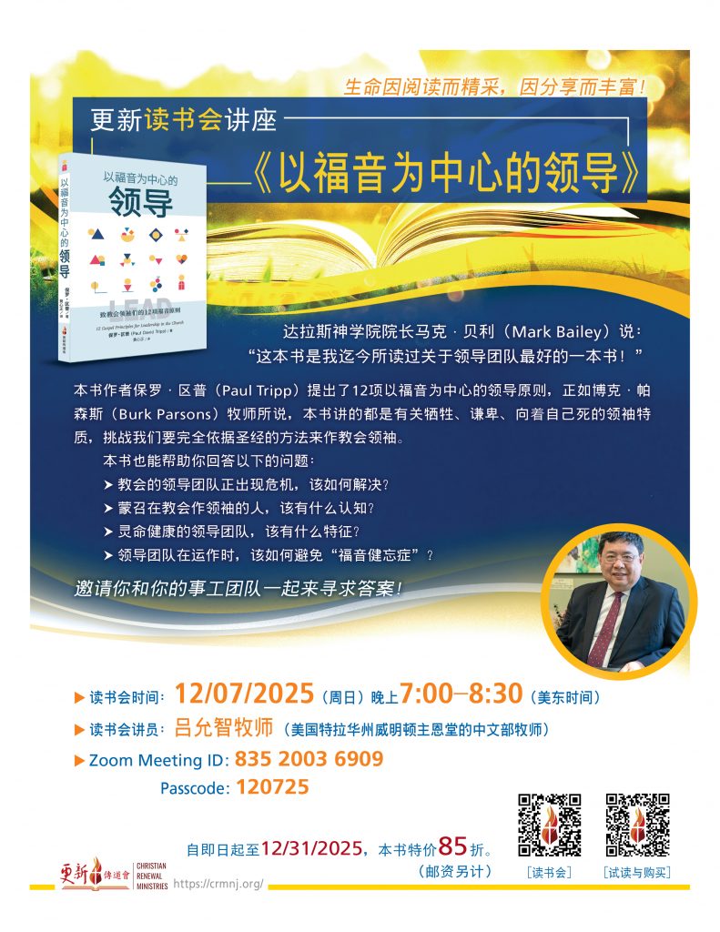 值此新年节庆,许多团契都在计画新一年的特别活动,更新特别推荐这个读书会讲座,它非常适合成为贵团契的一次特别聚会,可邀请旧雨新知一起参加,聆听美国大西洋社区宣道会的杨秉刚传道和许菁芬师母分享,如何作一个得胜者!
