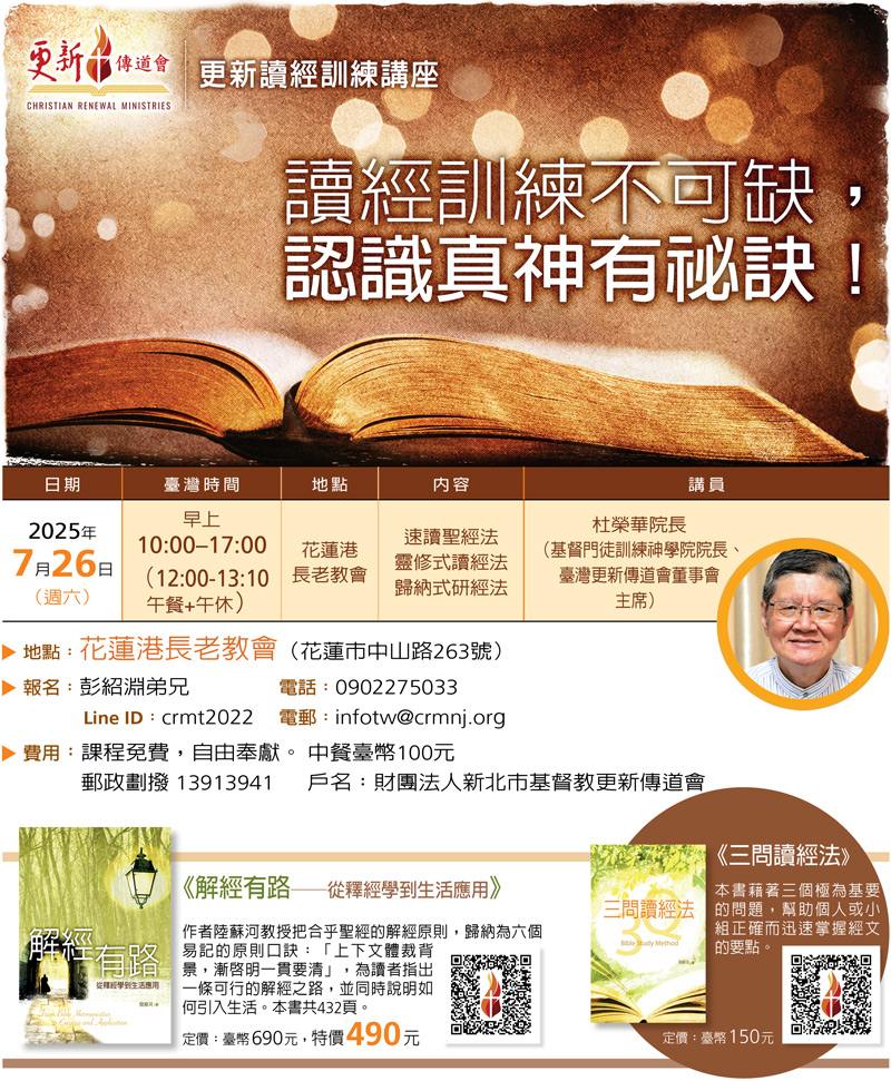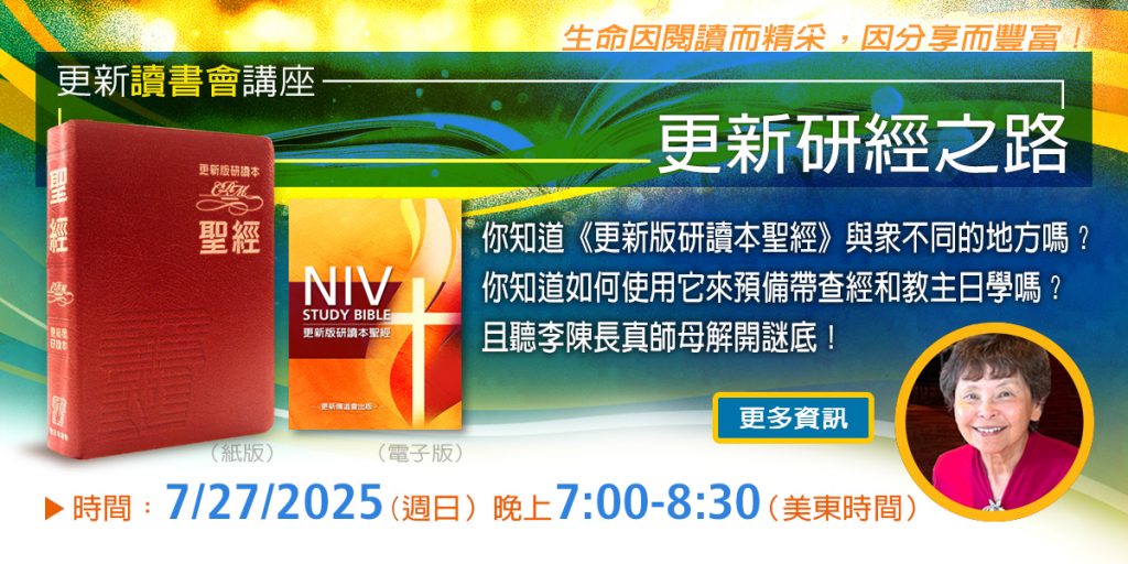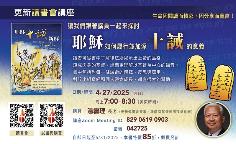 值此新年节庆,许多团契都在计画新一年的特别活动,更新特别推荐这个读书会讲座,它非常适合成为贵团契的一次特别聚会,可邀请旧雨新知一起参加,聆听美国大西洋社区宣道会的杨秉刚传道和许菁芬师母分享,如何作一个得胜者!